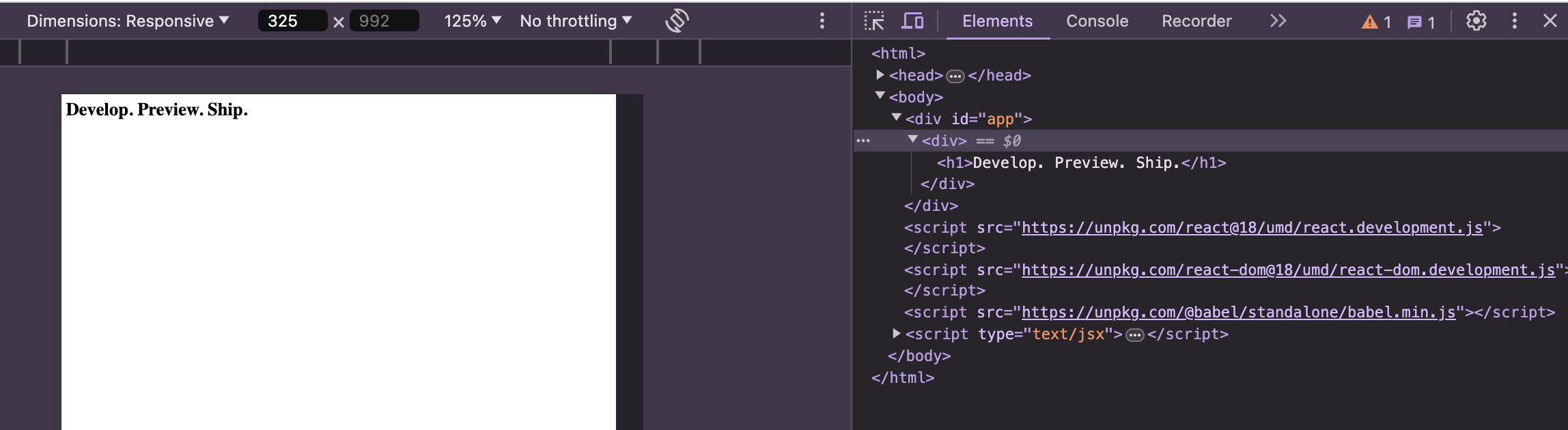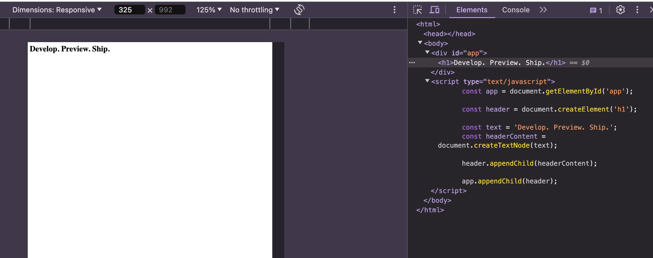 JavaScript と DOM メソッドを利用して h1 タグを追加する仕方を学びます。
