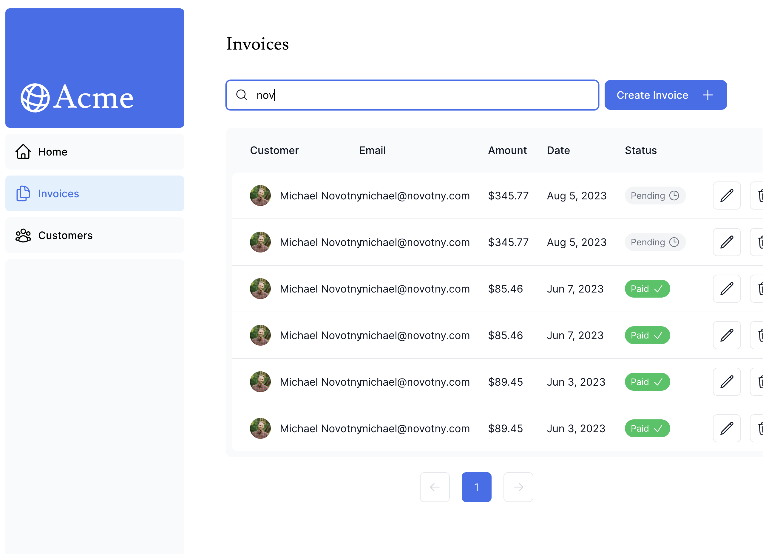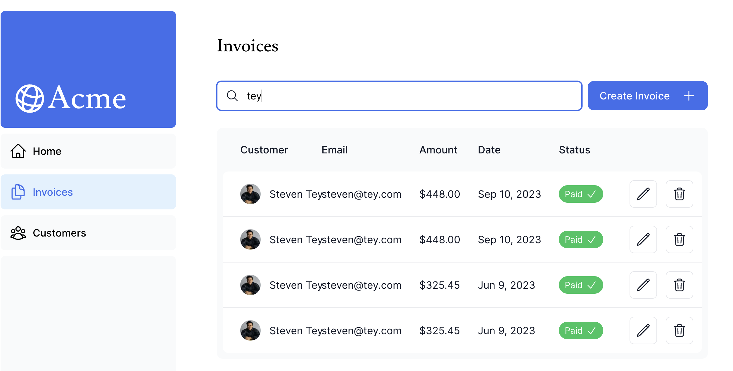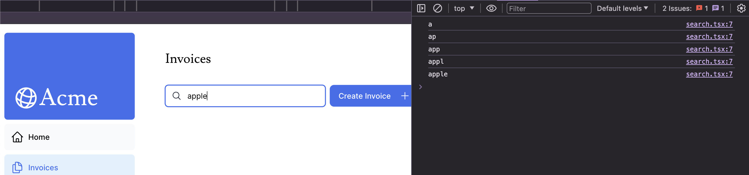 /invoices ページに検索とページネーションを追加していくようです。読んでいくとどうやら、検索パラメータは URL にそのまま埋め込むようです。こうすることでユーザーが結果をブックマークしたり URL 自体を共有することもでき、さらにサーバーサイドレンダリングによりこれらをキャッシュしたり解析と追跡を行うことも容易になるようです。