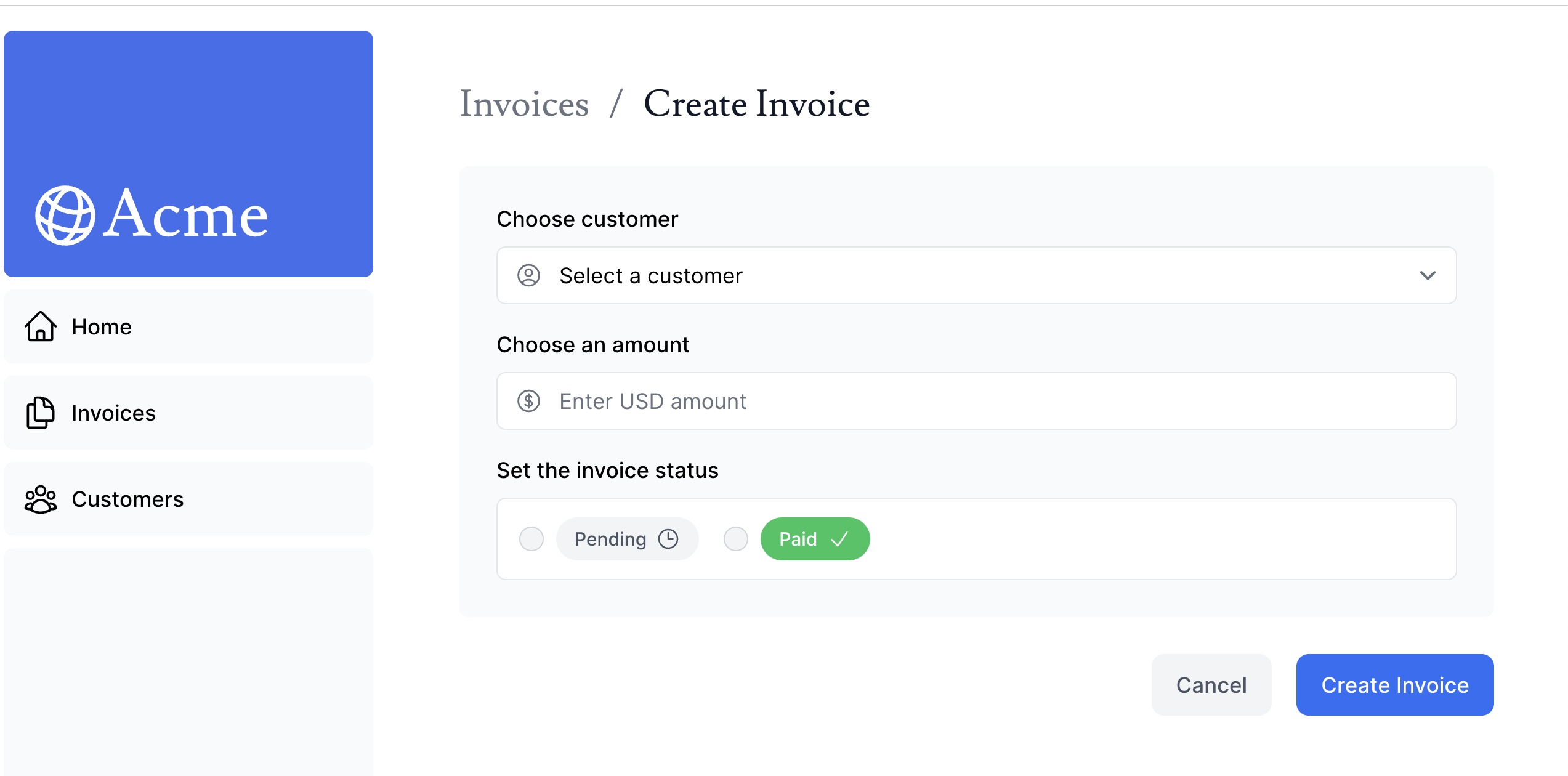 早速実装を始めていきます。まずは invoices/create/page.tsx というファイルを作成します。ひとまずチュートリアルにあるコードを入力していくと次のようなページができます。