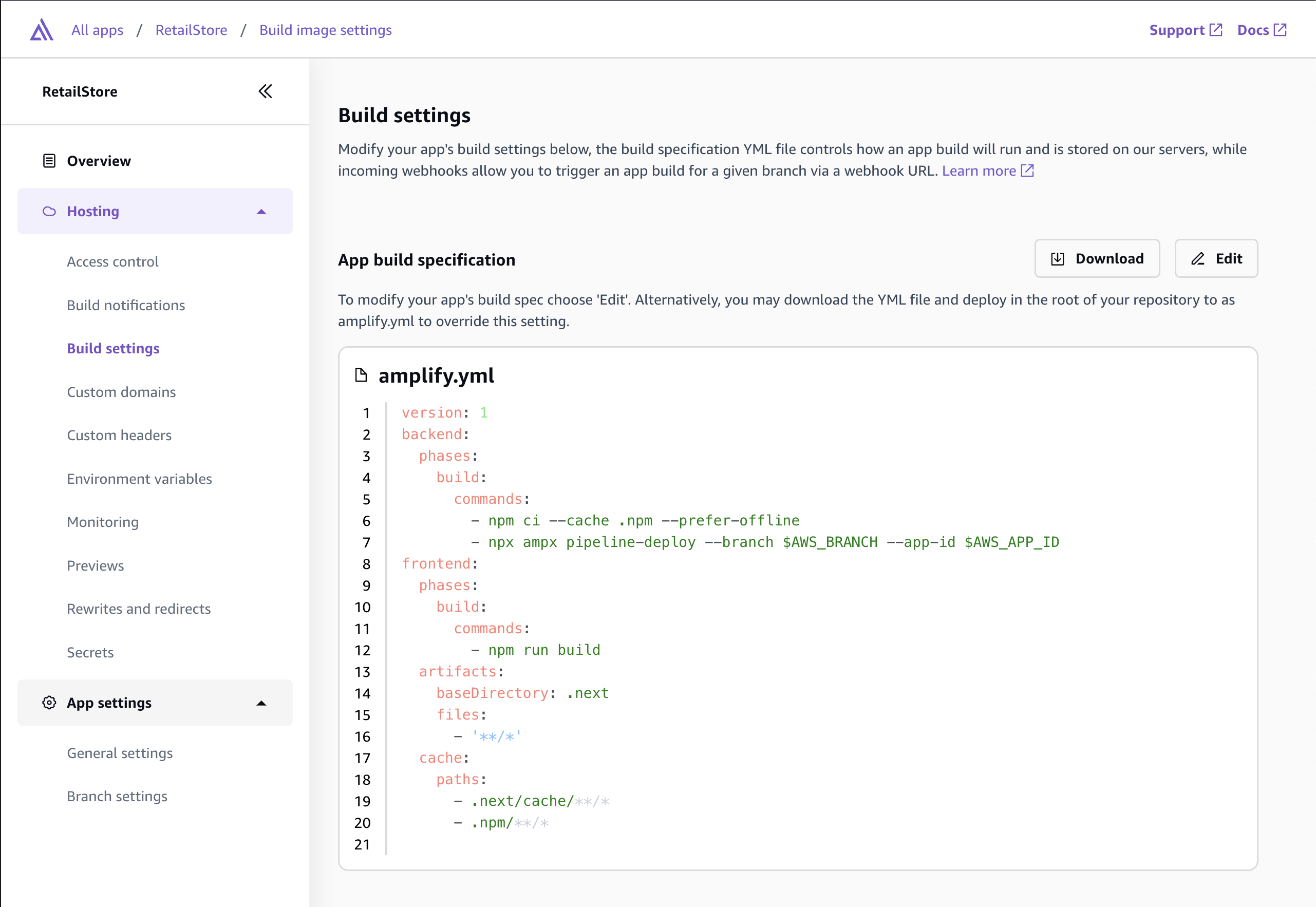 amplify.yml というファイルを使えばビルド時の指定などができるようです。おそらくバックグラウンドは CodeBuild かと思うのですが、CodeBuild 自体のプロジェクトは作成されていませんでした。さらにこの YAML ファイルの設定は微妙に CodeBuild とは異なるようにも見えます。