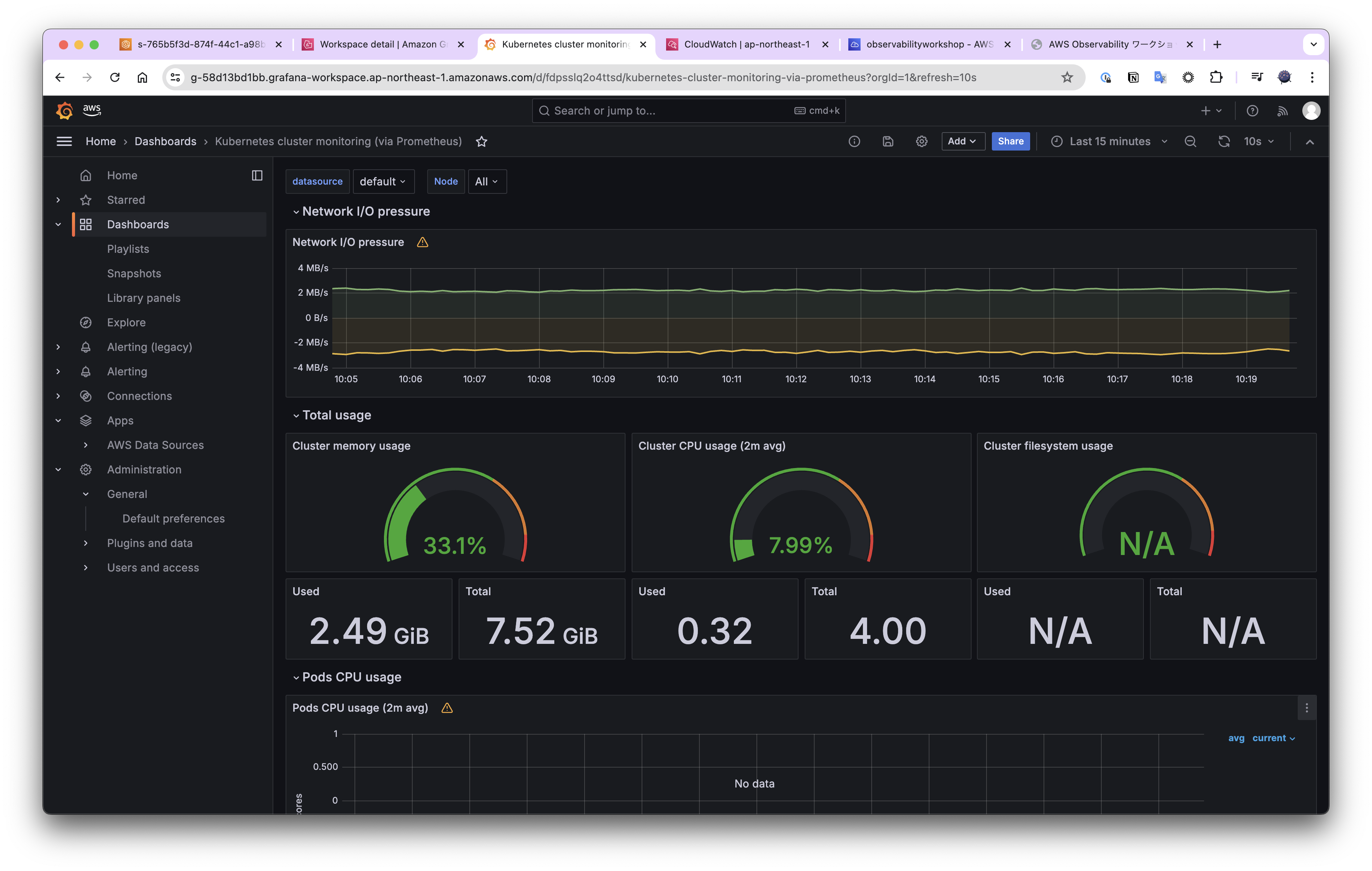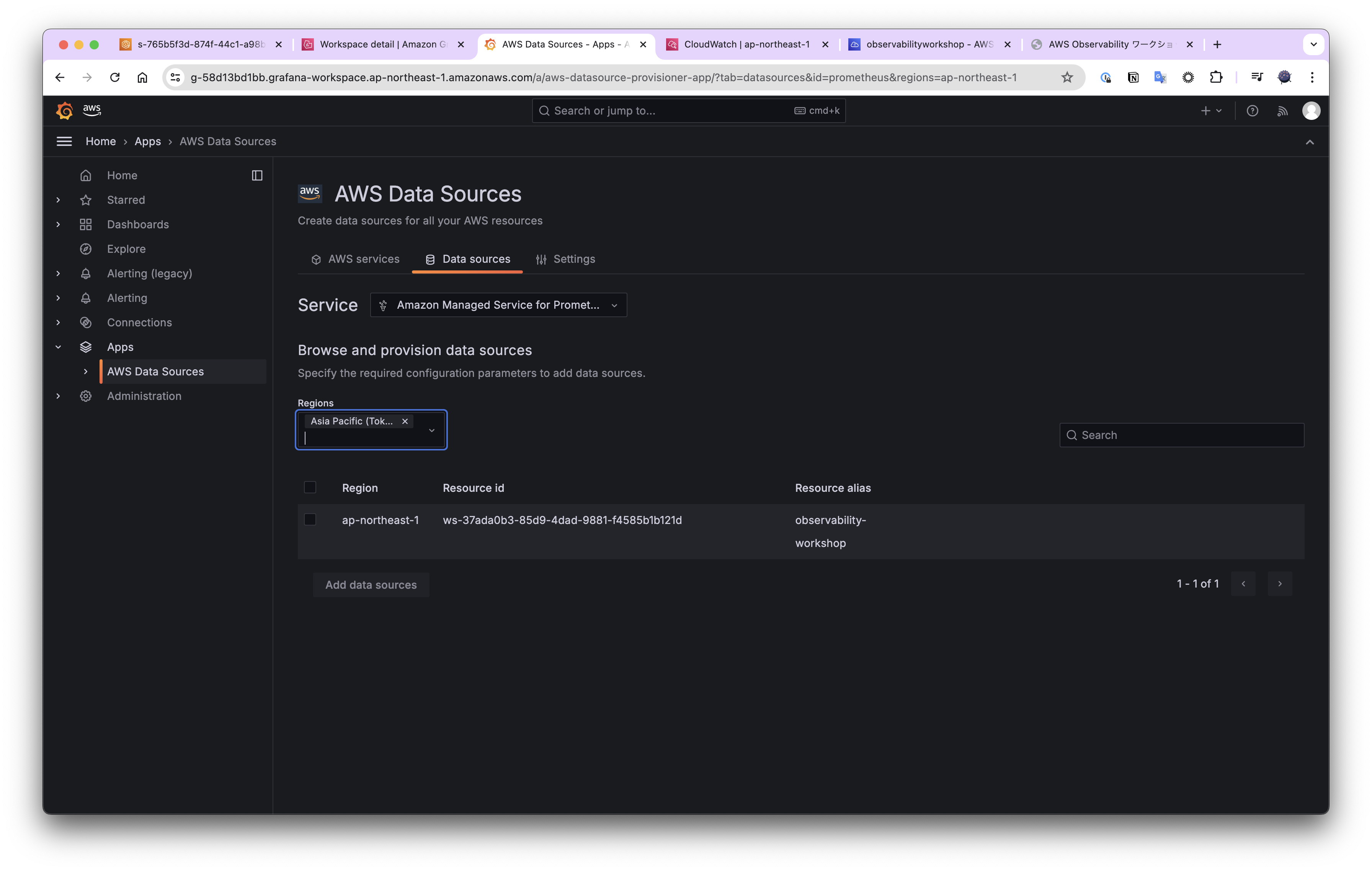 続いて表示されている URL を踏めば SSO のログイン画面が出てきてログインすれば普通に Grafana の画面に遷移できました。このまま AWS データソースの設定を行います。これも Prometheus の章で作成したものが表示されています。