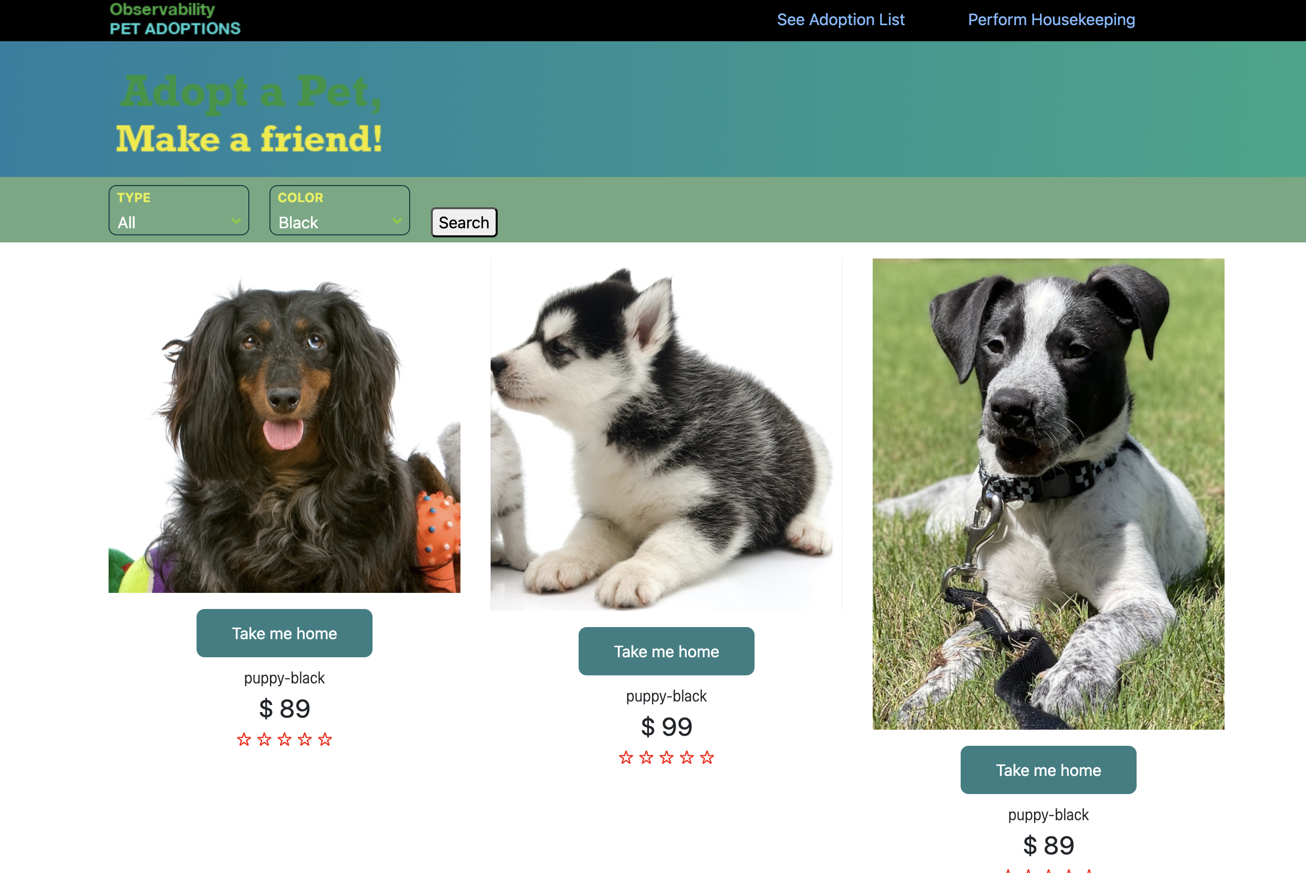 アーキテクチャ図を見てみると、大きく 4 つの要素に分かれたマイクロサービスアーキテクチャのようになっているようですね。このアプリケーションではペットを探しお家に連れ帰ることのできるサービスのようで引き取るときにお金を支払う必要があるようです。